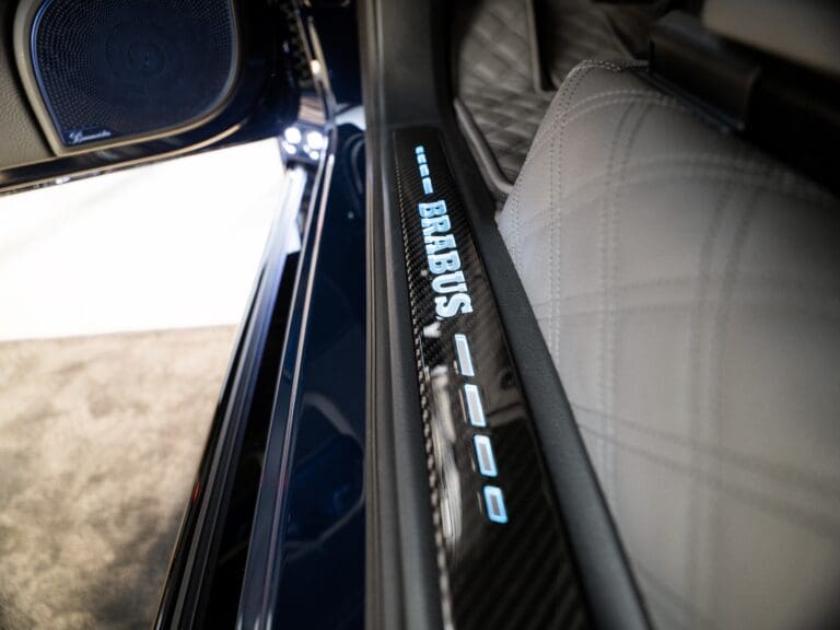 - BRABUS Einstiegsleisten aus Carbon mit beleuchtetem BRABUS-Logo, das von Weiß auf die aktuelle Ambientefarbe wechselt (64 Farben)
